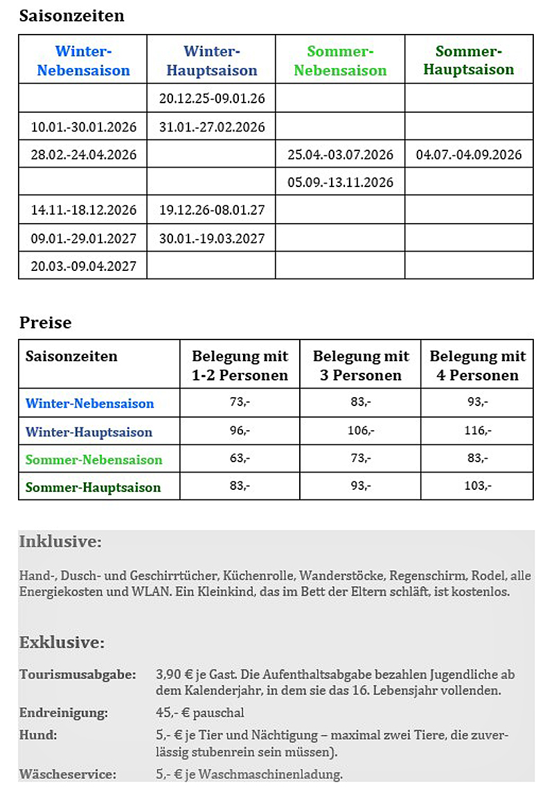 Buchbare Zeiten, Saisonzeiten und Preise