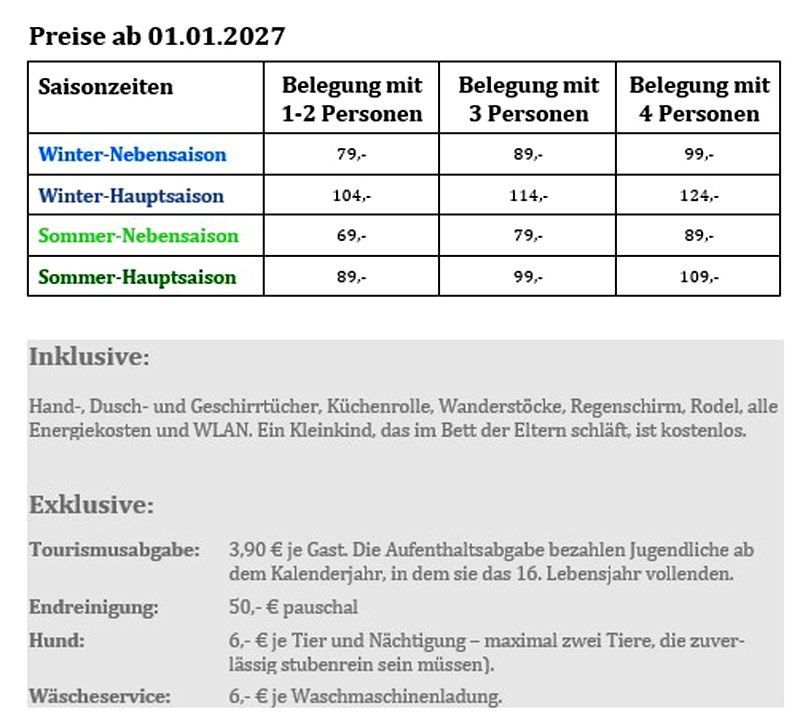 Der Gast ist verpflichtet, die vereinbarte Miete der Ferienunterkunft für die Vertragsdauer zu entrichten. Eine Anzahlung ist nicht zu leisten. Der gesamte Mietpreis ist spätestens am Tag vor Beendigung der Mietzeit per Barzahlung zu entrichten.